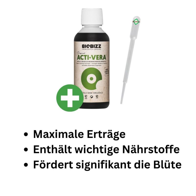 - Für alle Pflanzen: BioBizz Acti-Vera eignet sich für jede Phase, ob Keimling oder Blüte. Unterstützt die Pflanzen optimal und fördert nachhaltiges Wachstum.