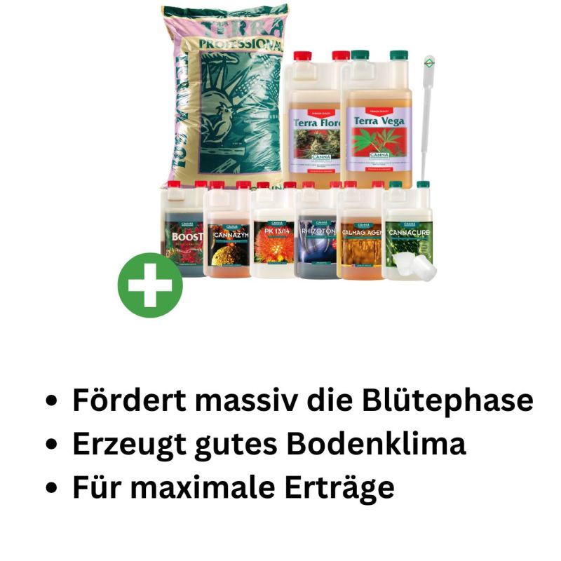 - Blütenförderung: 1 Liter Canna Terra Flores – unterstützt eine üppige Blüte für reichhaltige Blütenbildung.