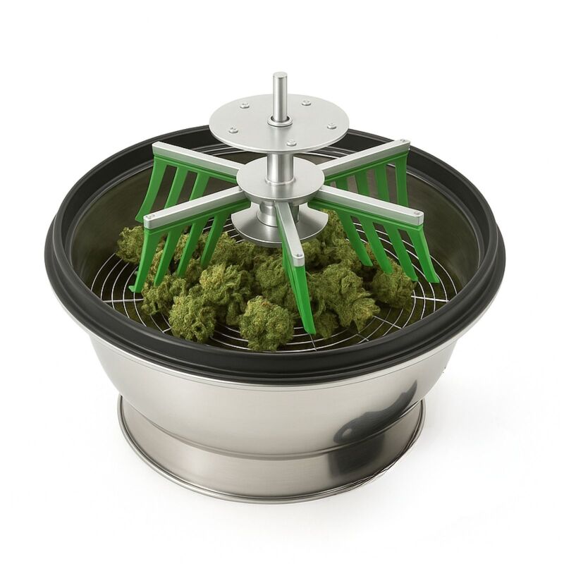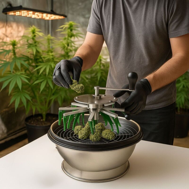 Der perfekte Helfer für deine Ernte: Diese hochwertige Erntemaschine macht die Arbeit zum Kinderspiel. Einfach den Deckel abnehmen, frisches Pflanzenmaterial auf das zentrale Gitter legen, Deckel wieder schließen und die Kurbel drehen. In nur wenigen Umdrehungen werden die Blüten sanft und effizient von überschüssigen Blättern befreit – für ein sauberes und präzises Ergebnis.